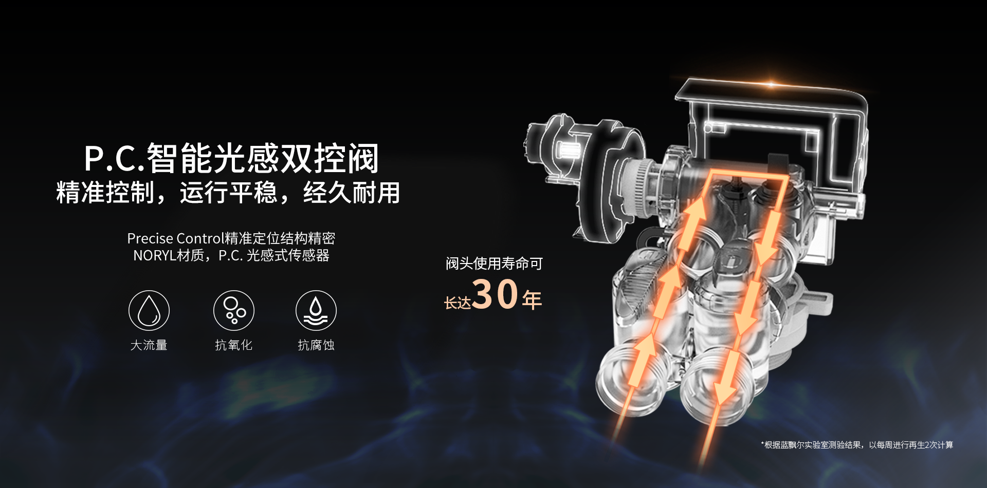 首先,藍飄爾采用了NORYL材質的P.C.智能光感雙控閥,該雙控閥能夠更精準地控制流量。不僅結構更精密更抗壓耐磨損,而且還能適應各種水質,不易造成閥頭卡頓。根據(jù)藍飄爾實驗室數(shù)據(jù),以每周再生2次計算,P.C.智能光感雙控閥使用壽命可長達 30年,滿足10萬次以上壓力循環(huán)測試。