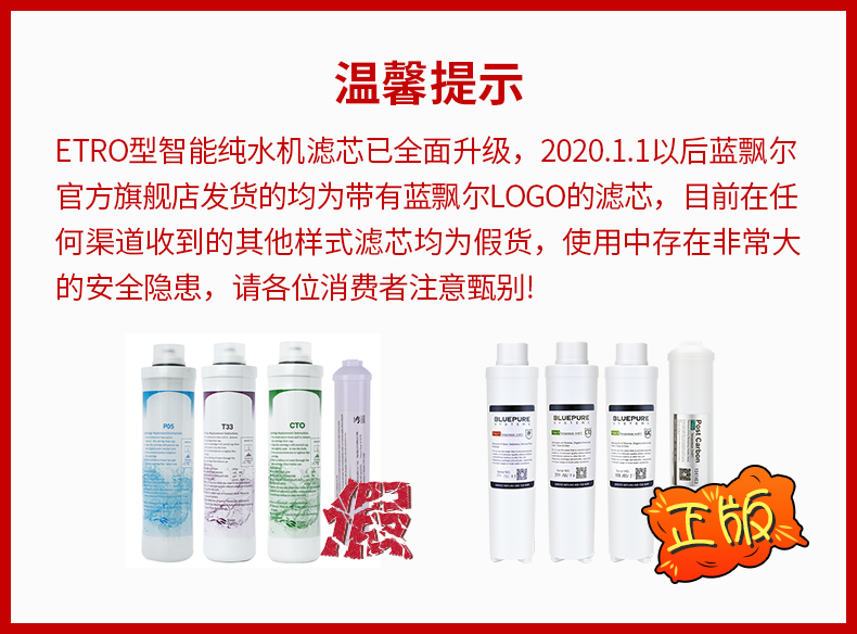 藍(lán)飄爾凈水再次提醒大家自2020年1月起銷售的ETRO和MINI濾芯都是升級后的濾芯,次品、山寨、無品牌LOGO等假冒產(chǎn)品往往是三無產(chǎn)品,衛(wèi)生與健康缺乏最基本保障!所以,大家千萬不要傻傻分不清,若購買劣質(zhì)假冒濾芯導(dǎo)致產(chǎn)品爆瓶引起巨大損失,藍(lán)飄爾公司概不承擔(dān)任何損失費(fèi)用。