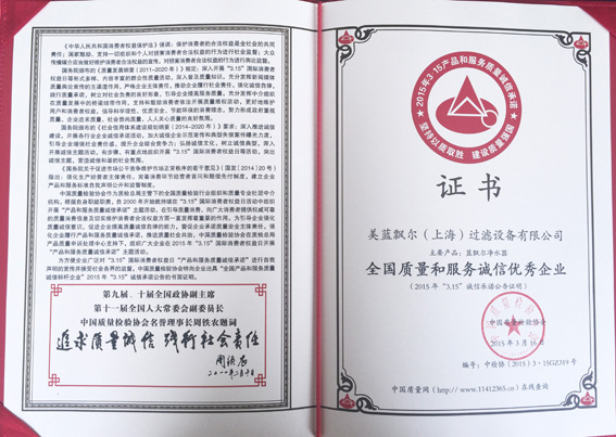 美藍(lán)飄爾(上海)過濾設(shè)備有限公司憑借卓越的產(chǎn)品質(zhì)量、穩(wěn)定的產(chǎn)品品質(zhì)、較高的市場(chǎng)知名度,獲得了社會(huì)各界的一致認(rèn)可,榮獲全國質(zhì)量和服務(wù)誠信優(yōu)秀企業(yè),這也是藍(lán)飄爾凈水在3.15期間榮獲該項(xiàng)殊榮。實(shí)際上在每年的3.15期間,公司都會(huì)積極配合全國各地工商部門、消費(fèi)者組織開展形式多樣的消費(fèi)者教育活動(dòng),宣傳合理消費(fèi)、安全消費(fèi)等健康消費(fèi)理念,通過各種宣傳幫助消費(fèi)者識(shí)別合法的渠道購買產(chǎn)品,以維護(hù)自身的權(quán)益,保障自身的健康。